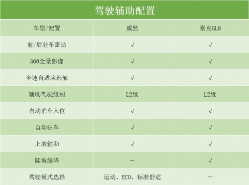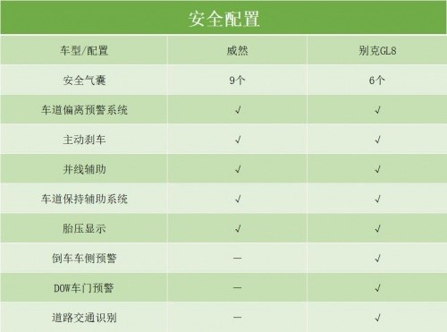 威然和別克GL8在安全配置、駕駛輔助配置上沒(méi)有拉開(kāi)太大差距。威然配備了9個(gè)安全氣囊,別克GL8僅配備了6個(gè)安全氣囊,而車道偏離預(yù)警系統(tǒng)、主動(dòng)剎車、并線輔助、車道保持輔助系統(tǒng)和胎壓顯示均有配備。不過(guò)別克GL8多出了倒車車側(cè)預(yù)警、DOW車門預(yù)警以及道路交通識(shí)別。另外前后駐車?yán)走_(dá)、360全景影像、全速自適應(yīng)巡航、L2級(jí)輔助駕駛、自動(dòng)泊車入位等駕駛配置在兩臺(tái)車上都沒(méi)有缺席。威然還有多種駕駛模式可選。