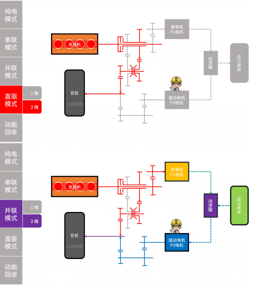 在混動結(jié)構(gòu)上,哈弗檸檬混動DHT采用雙電機(jī)混聯(lián)拓?fù)浣Y(jié)構(gòu),動力組合的選擇更加多元,可根據(jù)不同的車型做靈活布局。從而使得車輛能夠在EV行駛、串聯(lián)驅(qū)動、發(fā)動機(jī)直驅(qū)、能量回收、怠速停機(jī)等多種工作模式之間實(shí)現(xiàn)智能切換,實(shí)現(xiàn)全場景下動力與油耗的完美平衡。