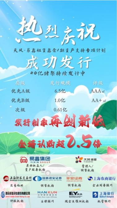 6月17日,上海易鑫融資租賃有限公司(以下簡稱“易鑫租賃”)成功發(fā)行“天風(fēng)-易鑫租賃鑫榮1期資產(chǎn)支持專項計劃”,募集資金8.11億元(人民幣,下同)。這是易鑫租賃本月獲批的40億元新儲架額度中的第一期。本次發(fā)行得到了新老投資人的大力支持,認(rèn)購倍數(shù)創(chuàng)下新高,發(fā)行利率亦為近年來新低的水平。