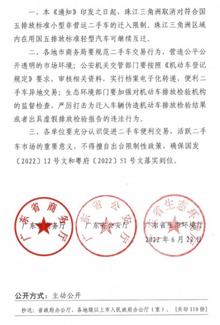 6月23日下午,廣東省商務(wù)廳、廣東省公安廳、廣東省生態(tài)環(huán)境廳發(fā)布通知,宣布即日起,珠三角洲取消對符合國五排放標(biāo)準(zhǔn)小型非運(yùn)營二手車遷入限制。珠三角洲區(qū)域內(nèi)在用國五排放標(biāo)準(zhǔn)輕型汽車可繼續(xù)互遷。