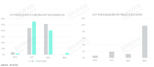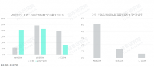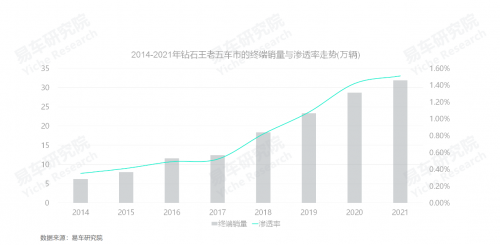 2018年起鉆石王老五購車用戶快速增加,2021年對(duì)中國車市的終端銷量貢獻(xiàn)突破30萬輛,滲透率升至1.51%