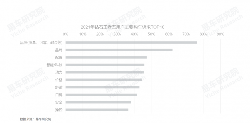 新生代主導(dǎo)的鉆石王老五的購車訴求非常注重品質(zhì),2021年,高居購車訴求榜首,其次是品牌與配置