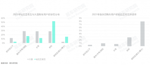 新生代主導(dǎo)的鉆石王老五車市呈現(xiàn)出高學(xué)歷的新特征,2021年,八成接受過高等教育,且學(xué)歷越高滲透率越高