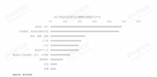 新生代主導(dǎo)的鉆石王老五的購車原因以自駕、體驗(yàn)等為主,2021年,兩者占比都近五成,越野緊隨其后,整體調(diào)性就是玩