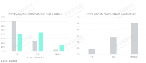 新生代主導(dǎo)的鉆石王老五的擁車數(shù)以兩輛及以上為主,2021年,占比近六成,且擁車數(shù)越高滲透率越高,3輛及以上超5%