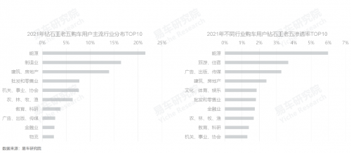 可能沒看數(shù)據(jù)之前,不少人士會(huì)覺得互聯(lián)網(wǎng)、金融等新興或高附加值行業(yè),是盛產(chǎn)鉆石王老五的主要行業(yè),但通過調(diào)研發(fā)現(xiàn),即便80后新生代主導(dǎo)了鉆石王老五購車用戶,不過該群體仍集中于能源、制造、房地產(chǎn)、批發(fā)零售等傳統(tǒng)行業(yè),2021年,前四者的占比分別為21.52%、16.45%、13.92%、7.72%。就滲透率看,位居榜首的仍然是能源行業(yè),可能與石油、煤炭、水利等需要長期野外工作有關(guān);