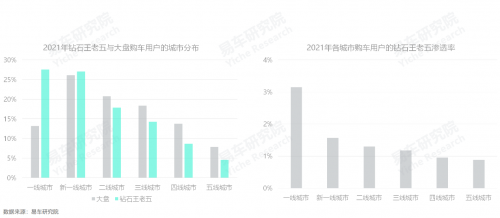 新生代主導(dǎo)的鉆石王老五車市集中大城,2021年,占比超七成,且城市級(jí)別越高滲透率越高,北上廣深突破3%