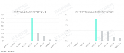 鉆石王老五車市的快速壯大,與新生代80后的涌入密切相關(guān),2021年,35-39歲用戶占比超六成,滲透率突破4%,且40-44歲也有部分80后;
