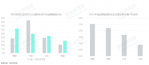 目前,擁有奧迪、奔馳、寶馬、保時(shí)捷等諸多高端品牌的德系,仍是鉆石王老五車市的強(qiáng)勢(shì)爭(zhēng)奪者。易車研究院調(diào)研發(fā)現(xiàn),2021年,鉆石王老五選購德系的占比超三成,位居榜首,同時(shí),德系的鉆石王老五的滲透率,也位居主流國別的榜首;