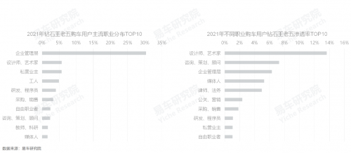 80后新生代的涌入,和近二十年中國社會(huì)的現(xiàn)代企業(yè)制度的加速建設(shè)、資本市場(chǎng)的加速開放與利益再分配機(jī)制的加速完善等,使得鉆石王老五的主體,實(shí)現(xiàn)了由老板個(gè)人向企業(yè)管理層的大轉(zhuǎn)變。易車研究院調(diào)研發(fā)現(xiàn),2021年,企業(yè)管理層在鉆石王老五車市的占比超三成,遙遙領(lǐng)先于其它任何一個(gè)職業(yè)。就滲透率看,設(shè)計(jì)師、藝術(shù)家是最高的,其次是咨詢與企業(yè)管理層;