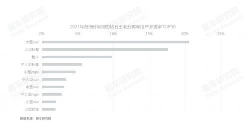 易車研究院調(diào)研發(fā)現(xiàn),2021年,雖然鉆石王老五用戶選購的主體仍是SUV與轎車,但對(duì)跑車情有獨(dú)鐘。從更細(xì)分的小級(jí)別看,大型SUV、大型轎車、跑車都是鉆石王老五用戶的最愛;