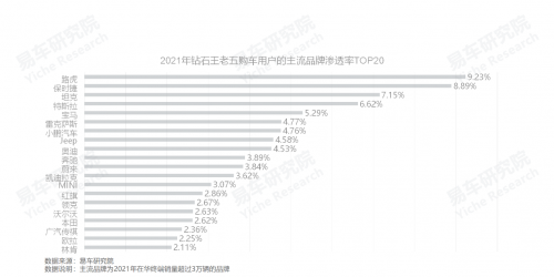 2021年,路虎領(lǐng)銜鉆石王老五車市的主流品牌滲透率排行,2022-2026年,將有更多品牌“玩”轉(zhuǎn)鉆石王老五車市