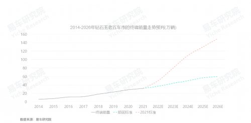 2022-2026年,如按2021標(biāo)準(zhǔn),鉆石王老五車市的銷量有望挑戰(zhàn)150萬輛,如按順延標(biāo)準(zhǔn),有望挑戰(zhàn)60萬輛