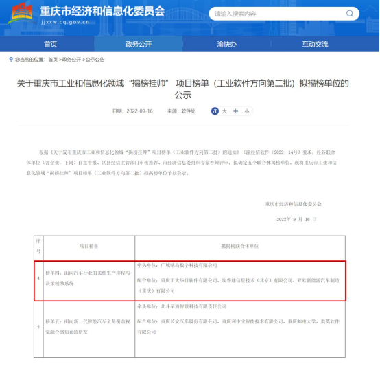 日前,重慶市工業(yè)和信息化領(lǐng)域“揭榜掛帥” 項目榜單(工業(yè)軟件方向第二批)擬揭榜單位出爐。由廣域銘島數(shù)字科技有限公司牽頭打造的“面向汽車行業(yè)的柔性生產(chǎn)排程與決策輔助系統(tǒng)”成功入圍,成為重慶市第二批工業(yè)軟件“揭榜掛帥”項目。