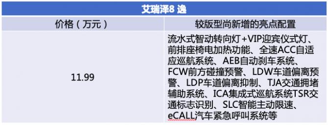 從艾瑞澤8-逸開始,配置上多了流水式智動轉向燈+VIP迎賓儀式燈、前排座椅電加熱功能、全速ACC自適應巡航系統(tǒng)、AEB自動剎車系統(tǒng)、FCW前方碰撞預警、TJA交通擁堵輔助系統(tǒng)、eCALL汽車緊急呼叫系統(tǒng)等貼心配置,科技感更強,尤其在智能出行方面更為突出。所以,該版本也值得推薦。