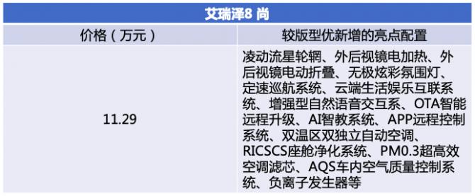 相比版型優(yōu),雖然艾瑞澤8-尚的價格提高了4000元,但配置新增了定速巡航系統(tǒng)、云端生活娛樂互聯(lián)系統(tǒng)、增強型自然語音交互系、OTA智能遠程升級、AI智教系統(tǒng),APP遠程控制系統(tǒng)、C-PURE奇瑞凈立方座艙等,用戶多花4000元就能夠買到更豐富的安全性、娛樂性及舒適性配置,讓該版本性價比頗高。