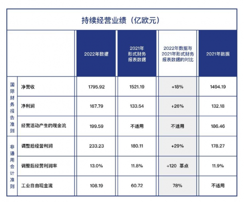 凈營(yíng)收達(dá)1796億歐元,與2021年形式財(cái)務(wù)報(bào)表數(shù)據(jù)相比增長(zhǎng)了18%。體現(xiàn)了集團(tuán)強(qiáng)勁的定價(jià)策略,有利的車(chē)型組合及積極的外匯折算效應(yīng)