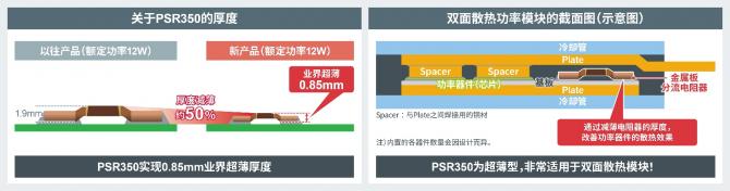 PSR350利用ROHM垂直統(tǒng)合型生產(chǎn)體系的優(yōu)勢,通過優(yōu)化材料和制造工序,以12W級額定功率實現(xiàn)了約為以往產(chǎn)品一半高度的0.85mm超薄封裝。越來越多的車載主驅(qū)逆變器等產(chǎn)品開始采用雙面散熱功率模塊,而ROHM的新產(chǎn)品使其內(nèi)置功率器件芯片(IGBT或SiC MOSFET)和功率分流電阻器成為可能,這將有助于主驅(qū)逆變器的小型化發(fā)展。