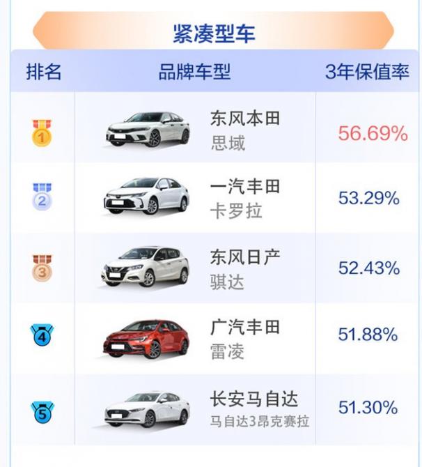 緊湊型車上榜車型均為日系車,且保值率差距小,同級競爭依舊激烈。其中,東風本田思域保值率56.69%位居榜首,其市場保有量大且相對價格體系穩(wěn)定,雖仍為細分市場保值率第一名,但相比2022年63.68%的數(shù)據(jù)下降明顯。