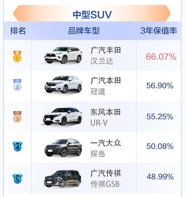 中型SUV市場保值率整體水平也出現(xiàn)了一定程度的下降,但漢蘭達保值率依舊非常穩(wěn)定,在該級別遙遙領先;受新車優(yōu)惠幅度增大的影響,冠道和UR-V雖然排名未變,但已經(jīng)與漢蘭達拉開差距。