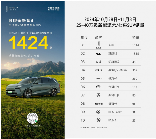 據最新銷量數據顯示,魏牌全新藍山在10月份交出了6180輛的亮眼成績單,且在10月最后一周(10月28日-11月3日),全新藍山還以1424輛的周銷量再度超越理想L8,問鼎30萬級新能源大六座SUV榜首,展現出了強大的市場競爭力。