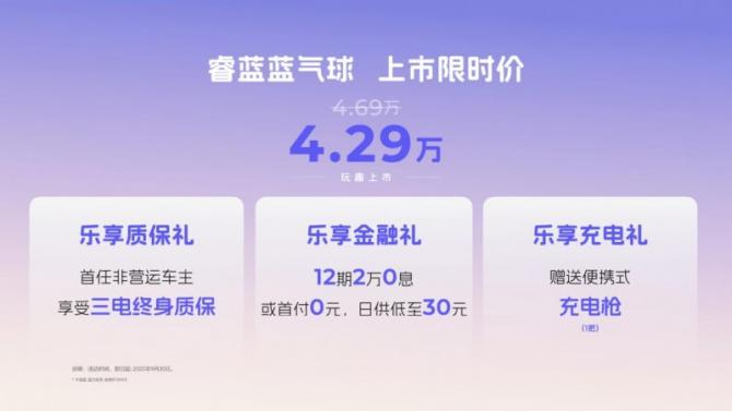 9月13日,睿藍(lán)汽車全新A00級(jí)純電車型睿藍(lán)藍(lán)氣球驚喜上市。新車正式公布,官方指導(dǎo)價(jià)4.69萬(wàn)元,截止9月30日,下訂即享1000元訂金抵5000元購(gòu)車金,上市限時(shí)價(jià)4.29萬(wàn)元,并同步啟動(dòng)全國(guó)銷售,以全面領(lǐng)先的產(chǎn)品力進(jìn)軍微型純電市場(chǎng),重新定義城市短途出行的價(jià)值標(biāo)桿。