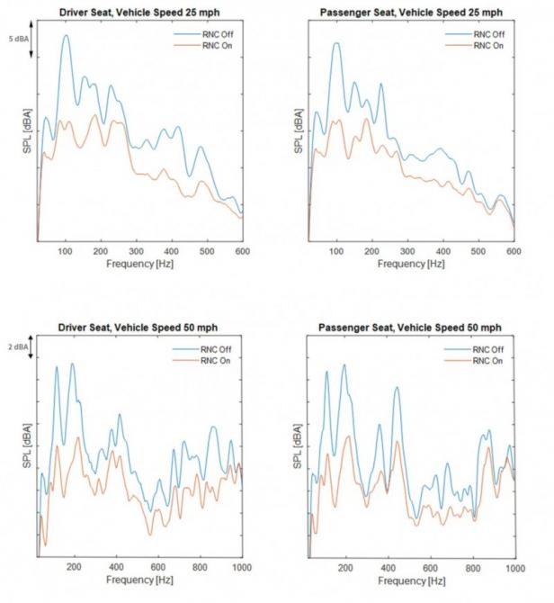 在50 mph*(英里/每小時)時,系統(tǒng)控制帶寬拓展至 1 kHz,高頻峰值降低 5 dB,整體400–1000 Hz頻段衰減約 3 dB。