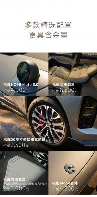 新車將會搭載Milestone Edition套件,包括專屬金屬尾標(biāo)、門檻踏板以及頭枕刺繡。此外,新車還會標(biāo)配Moon套件、20英寸輪圈、NOMI Mate 3.0、女王副駕以及氛圍套裝,總價值達(dá)2.44萬元。