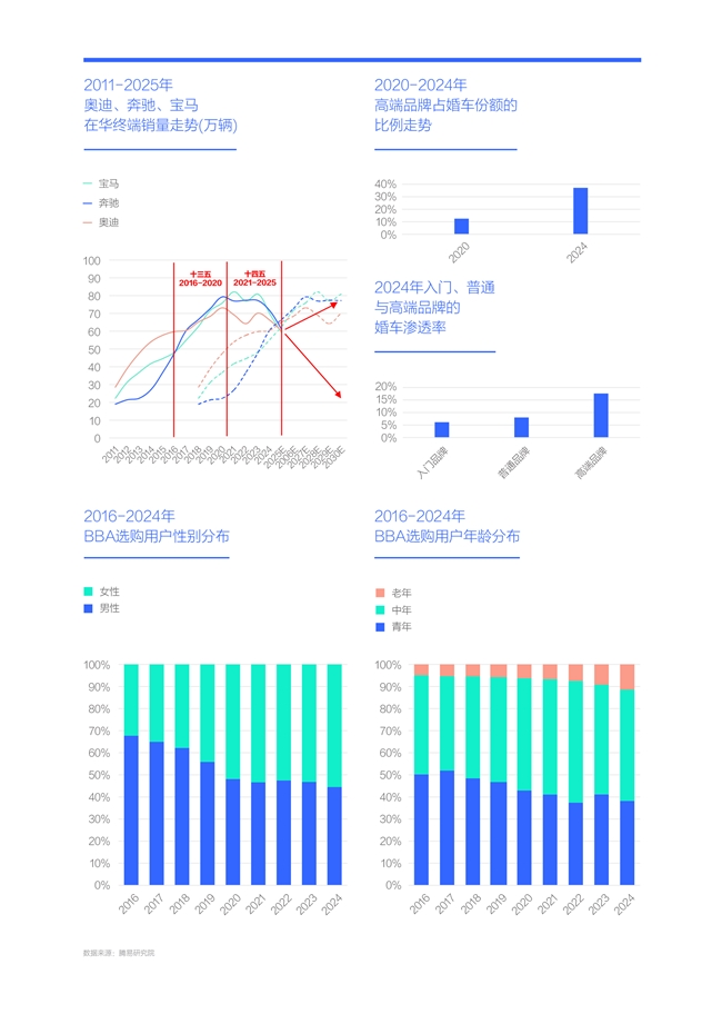 十四五期間BBA之所以能避免銷量崩盤,主要是女性與結(jié)婚兩撥用戶為品牌力突出的BBA創(chuàng)造了新機(jī)遇:近十年,中國女性車市持續(xù)擴(kuò)大,2024年終端銷量突破900萬輛,市占率逼近40%。女性以家庭增購為主,且女性更注重品牌,便于品牌力突出的BBA更好抓住女性機(jī)遇;近十年,中國社會(huì)的結(jié)婚購車持續(xù)升級(jí),2020-2024年高端品牌在婚車市場(chǎng)的市占率由不足12%飆升至36%,代表品牌BBA成為最大受益者,2024年奔馳位居高端品牌婚車銷量排行榜首,奧迪位居第二,寶馬位居第四,同時(shí)結(jié)婚用戶對(duì)BBA的銷量貢獻(xiàn)均突破20%;