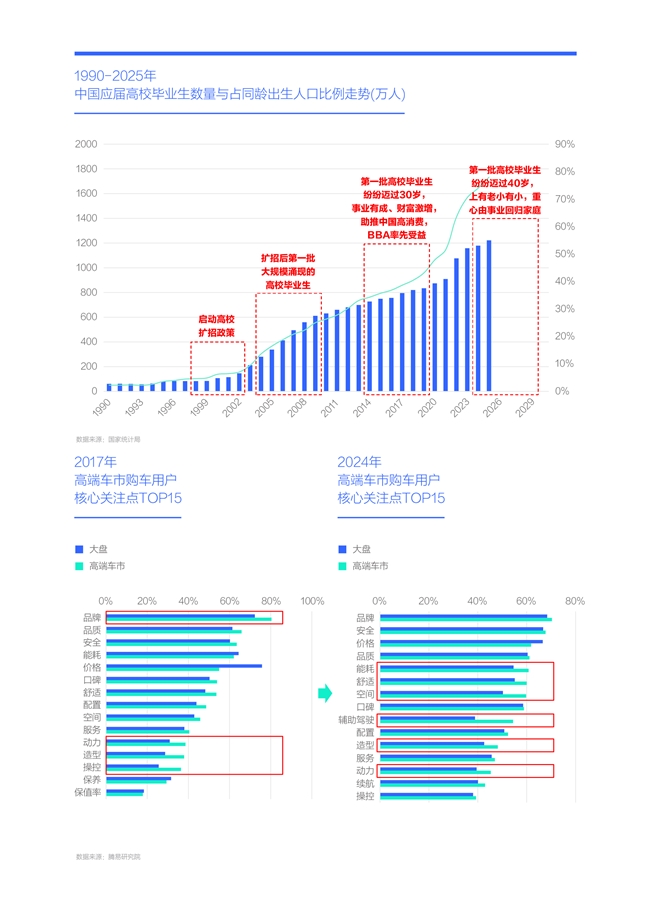 造就上述奇觀的核心推手就是20世紀(jì)末與21世紀(jì)初由中國政府主導(dǎo)的轟轟烈烈的高校改革(擴(kuò)招),當(dāng)時(shí)主要目的是緩解中國經(jīng)濟(jì)快速發(fā)展中的人才瓶頸挑戰(zhàn)。2003年起,中國社會(huì)快速涌現(xiàn)第一批大規(guī)模擴(kuò)招后的高校畢業(yè)生,他們正好趕上了中國加入WTO后對(duì)外貿(mào)易蓬勃發(fā)展與國內(nèi)互聯(lián)網(wǎng)經(jīng)濟(jì)快速崛起等諸多發(fā)展機(jī)遇,他們也不負(fù)眾望,快速成為新時(shí)代的弄潮兒。經(jīng)過十年左右摸爬滾打的第一批擴(kuò)招生,從2013年起陸續(xù)邁過30歲,完成結(jié)婚生子,組建起小家庭,也積累了不少家庭財(cái)富,進(jìn)入十三五后,他們掀起了買買買浪潮,尤其是高端奢侈品。在具體購車層面,高端品牌典型代表的BBA,成為第一批高校擴(kuò)招生買買買浪潮的最大受益者,BBA不僅能更滿足青年男性對(duì)動(dòng)力、操控等性能的要求,強(qiáng)大的品牌力也能幫助事業(yè)有成的青年用戶得到社會(huì)更好的認(rèn)可。在高端車市的關(guān)注點(diǎn)排行中,雖然動(dòng)力、操控相對(duì)靠后,但它們對(duì)比大盤都比較突出,這種差異性容易成為產(chǎn)品的獨(dú)特賣點(diǎn),更好吸引用戶;