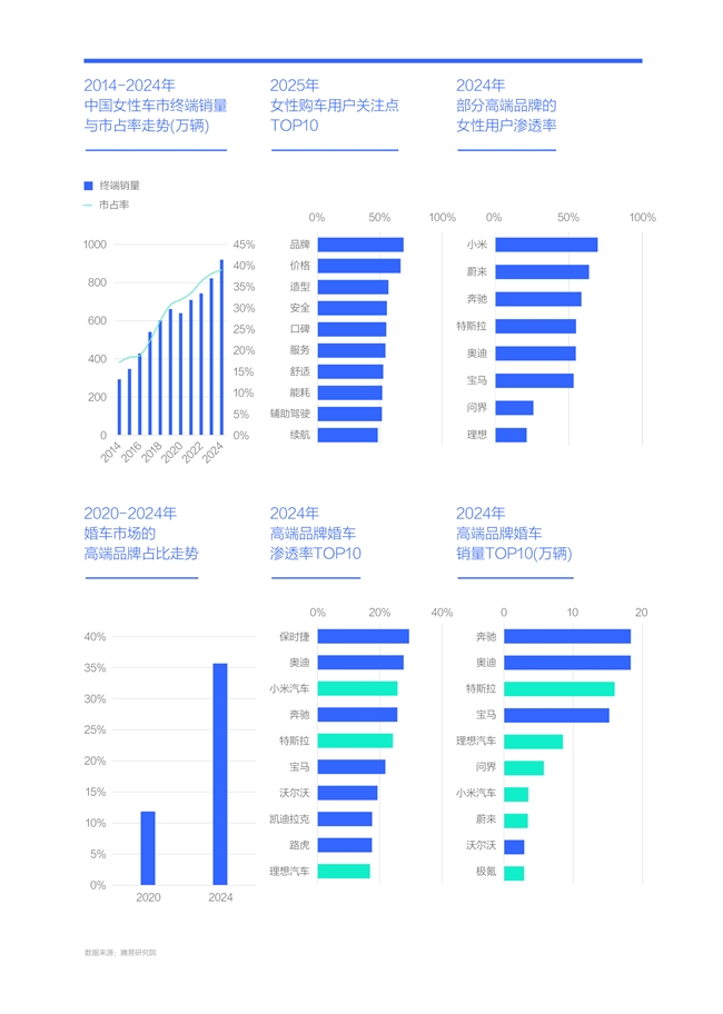 面對(duì)十三五那波以優(yōu)質(zhì)青年家庭為主的新機(jī)遇,BBA是最大受益者,沒有之一,狼吞虎咽飽餐了一頓,雷克薩斯、沃爾沃等第二陣營(yíng)也就喝點(diǎn)湯。但面對(duì)十四五的女性與結(jié)婚這兩大新機(jī)遇,BBA只能算主要受益者之一,特斯拉、小米等城市代步型新銳高端品牌也紛紛受益:2024年,奔馳、奧迪、寶馬的女性購車占比紛紛突破50%,但小米逼近70%,蔚來突破60%,特斯拉50%多,哪怕問界、理想也有20%多,也能在女性車市分一杯羹;2024年,雖然奔馳、奧迪與寶馬分別位居高端品牌婚車銷量TOP4,但TOP10中,新銳高端品牌占了六席,其中特斯拉位居第三,與BBA不相上下。